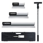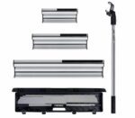 El juego de espátulas WK500540 Incluye mango telescópico de 850-2050 mm, 3 espátulas de emplastecer, 3 hojas de repuesto, maletín de transporte y manual de instrucciones. Largo de 300-500-800 mm y ancho de 85 mm.